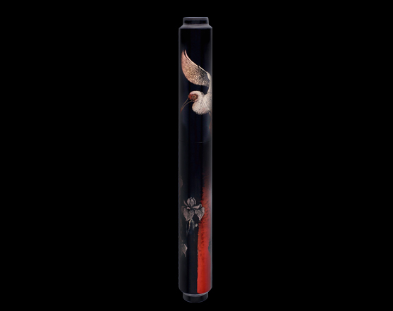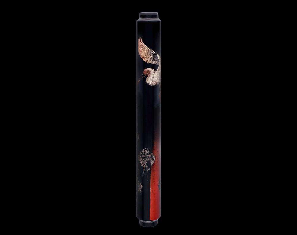 In January 2024, the Noto Peninsula was struck by a powerful earthquake. From that darkness arose a prayer for renewal — that light would return, and happiness once again descend upon Noto like a toki, the crested ibis, gliding over the river at dawn. The ibis, symbol of Noto, is rendered with minute dotted engraving filled with urushi lacquer, then colored in gold, platinum, and a touch of red pigment to express grace and life. The kakitsubata iris, whose message is “Happiness will surely come,” blooms beside it in gold, silver alloy, and purple pigment.