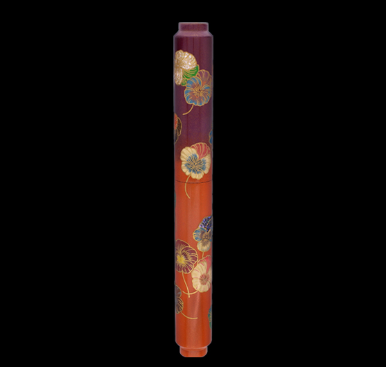 Blooming from autumn through spring, the pansy is an annual flower long cherished in Japan for its quiet charm. This Maki-e lacquer fountain pen reflects that season of renewal through a background gradation that moves from deep purple into Araishu (orange-red), suggesting the gentle warmth of spring emerging from lingering cold. Fine gold round powder is scattered across the surface, fixed with colored urushi lacquer, and softly burnished, like light settling in the air.