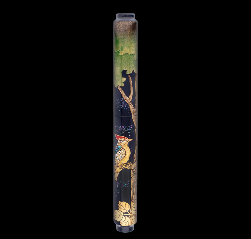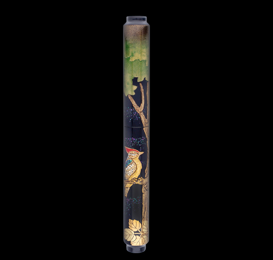 AP Limited Editions presents a charming Maki-e Lacquer Art expression of a Red Headed Woodpecker on a Birch tree. The birch trunk is raised in relief and finished with gold powder and hirame, then sealed in warm brown urumi-urushi, giving the bark a worked, weathered depth. Leaves are built up and dusted with gold in a soft gradation before being coated in green urushi. Behind the trunk, shell inlay is placed and covered in black urushi, then finished in shishiai togidashi to reveal the design through polishing. After the entire surface is refined, the red-headed woodpecker is rendered in takamaki-e using rankaku, aogai, and colored urushi. The Woodpecker rests beside a completed hollow—the labor already finished, the opening cleanly claimed. It has carved this space with purpose: a protected cavity for nesting, roosting and shelter.