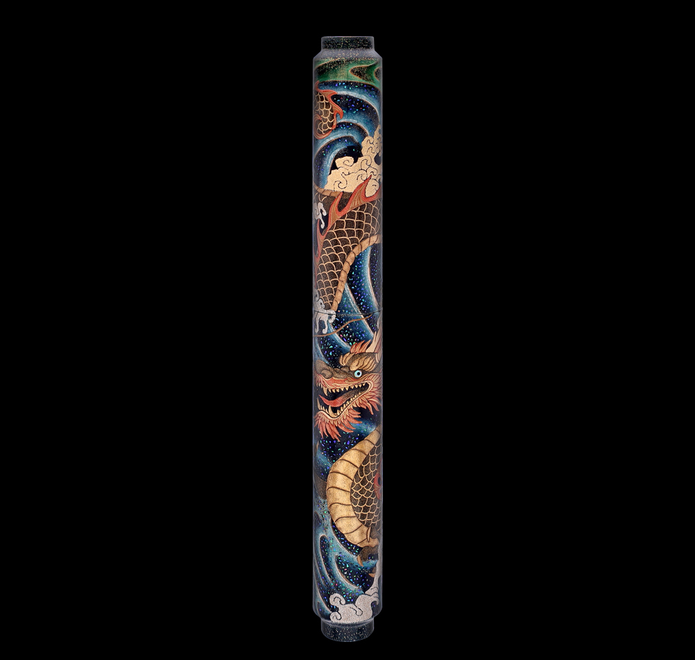 From the meeting of fire and ocean, a dragon rises — forged in gold, born of storm and blaze. Its body coils through waves of molten light, a creature of fury and splendor. The background glows with gold and shattered shell, sealed beneath layers of colored urushi that burn like embers beneath the surface. The waves, sculpted in thick, raised lacquer, crest with platinum and Hirame gold powder, their white edges searing against the dark waters. The dragon, built in high relief, is covered in gold and flame-tinted hues, each scale alive with shifting brilliance. Its eyes, cut from abalone shell over silver foil, blaze with an otherworldly fire — a gaze that commands the elements themselves. The sea beneath it glows with translucent green and blue urushi, sharpened to clarity like tempered glass — as if light itself had been trapped and tamed. A testament to power and motion, The Dragon of Flame and Sea is where the elements collide and creation ignites — a vision of unending strength, born in gold and sealed in fire.